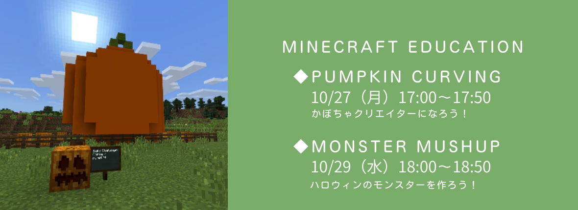 Pumpkin Curving | マイクラでオリジナルのジャック・オー・ランタンを作ります。 発想力と創造力を活かせるクラスです。 | 2025/10/27 17:00 |